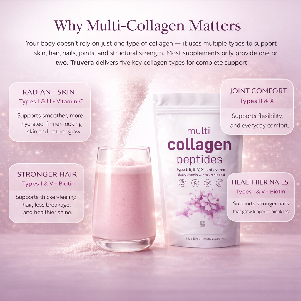Many collagen products contain only one or two types. Truvera provides five key collagen types plus supportive nutrients for more complete structural support.